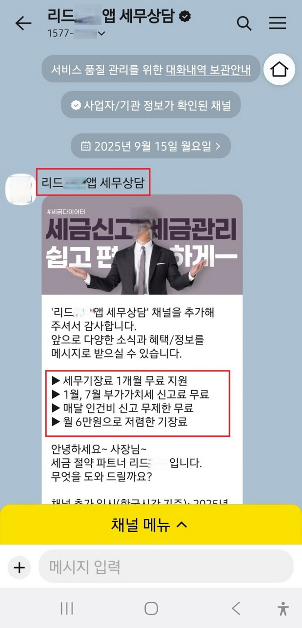 | ▲월 6만원의 기장료를 내세우며 홍보하는 리드○○의 카카오채널 |