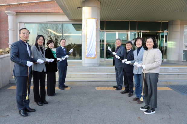 | ▲이명구 관세청장(왼쪽에서 4번째)이 22일 충남 관세국경인재개발원에서 직원들과 현판 제막식을 하고 있다[관세청 제공] |