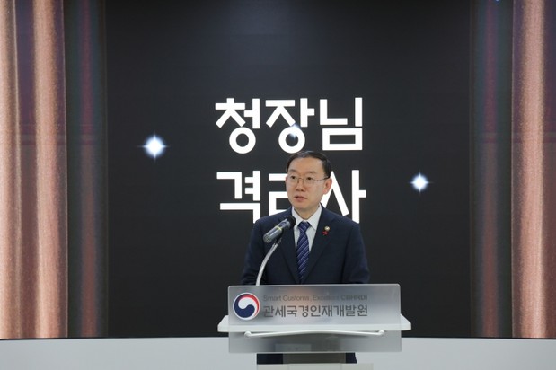 | ▲22일 관세국경인재개발원 현판 제막식에서 이명구 관세청장이 격려사를 하고 있다. |