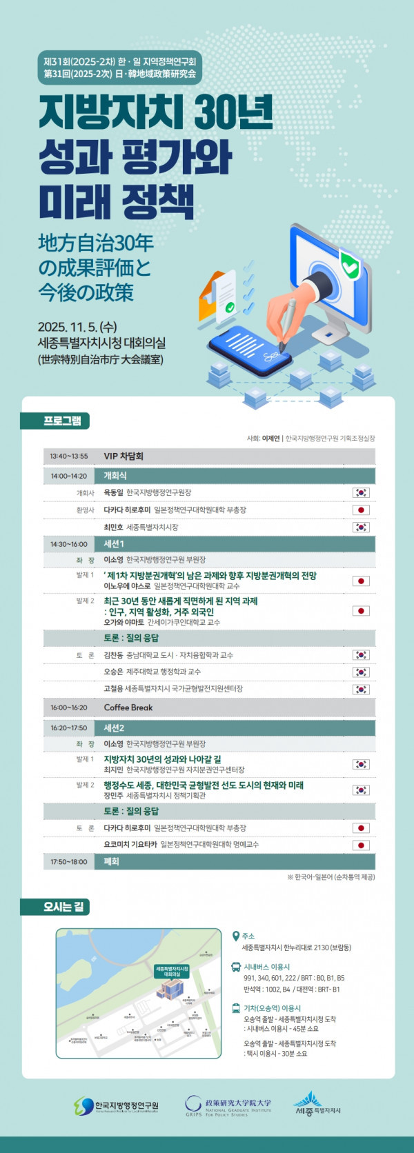 한국지방행정연구원(원장 육동일)은 일본정책연구대학원대학(GRIPS) 및 세종특별자치시(시장 최민호)와 공동으로 ‘제31회(2025-2차) 한·일 지역정책연구회’를 11월 5일(수) 세종특별자치시청 대회의실에서 개최한다.