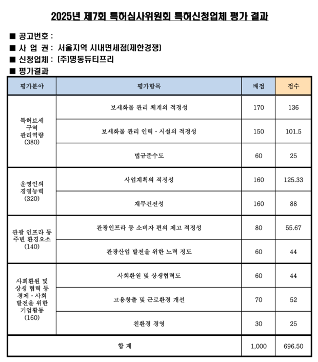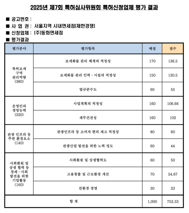다음은 관세청이 「관세법시행령」 제192조의5 제6항에 따라 공개한 서울 시내면세점 신규 특허 평가 결과.