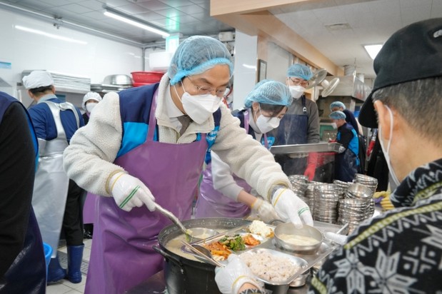 | ▲3일 떡국 배식 봉사를 하고 있는 구재이 한국세무사회장. |