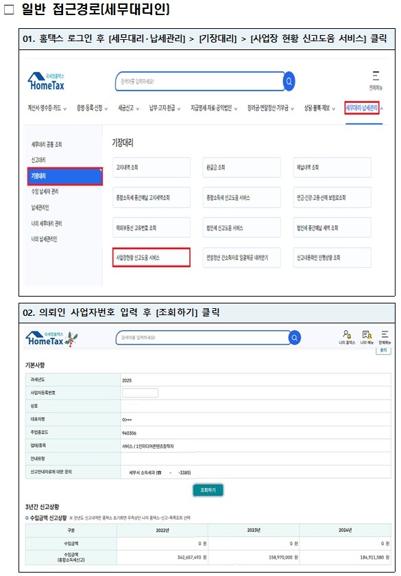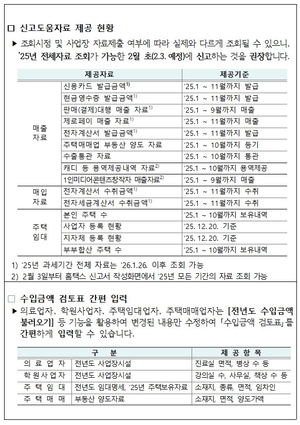 홈택스, 손택스에서는 사업자의 전자(세금)계산서·신용카드·현금영수증 매출내역 및 매입자료를 ‘신고도움자료’로 제공하며, 최근 3개 과세기간의 사업장 현황신고·종합소득세 신고현황도 안내한다.