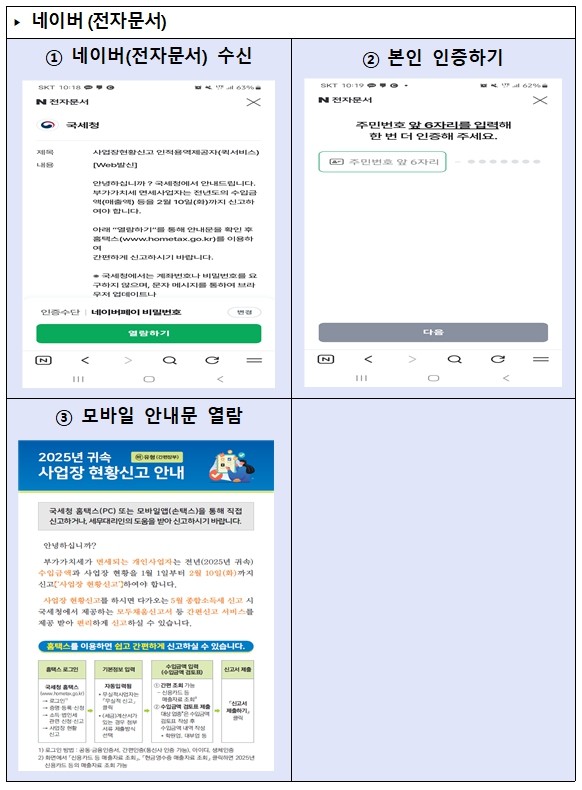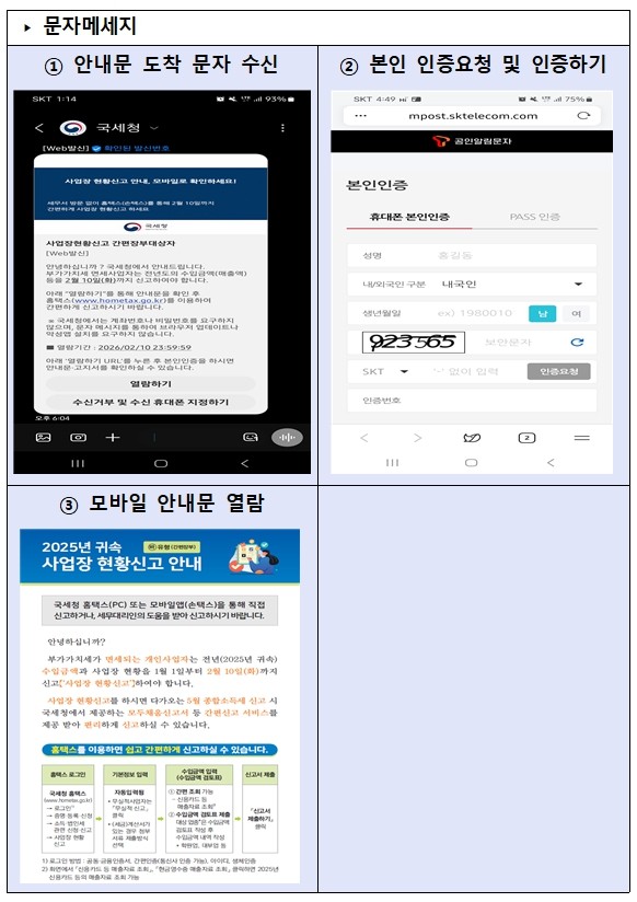 국세청(청장 임광현)은 병·의원, 학원, 농축수산물 도매업, 주택 임대 및 매매업, 캐디 등 인적용역사업자, 연예인 등 부가가치세 면세사업자 167만 명에게 오는 21일부터 ’25년 귀속 사업장 현황신고 안내문을 모바일을 통해 발송했다고 19일 밝혔다.