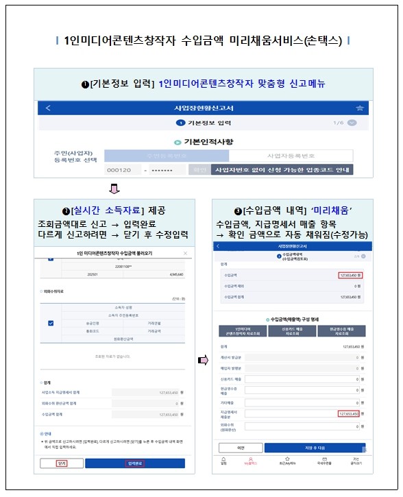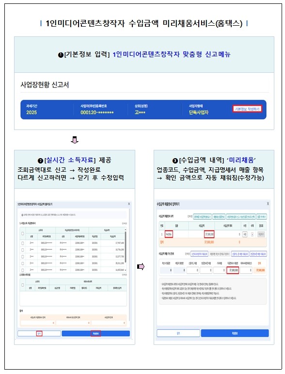 특히, 신고경험이 부족한 캐디, 대리운전기사, 퀵서비스배달원 등 인적용역사업자와 올해 처음 신고를 안내하는 1인미디어콘텐츠창작자에게 수입금액을 자동 작성할 수 있는 편의(미리채움 서비스)를 제공한다.