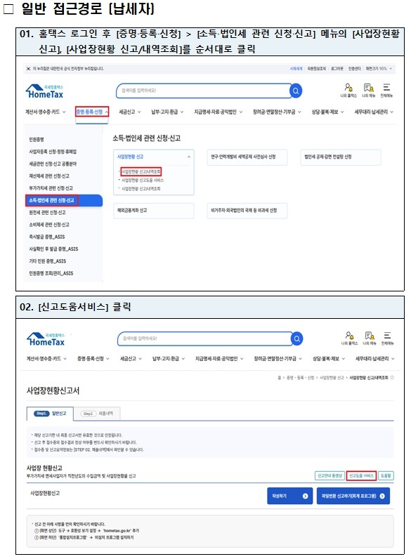 한편, 국세청은 사업장 현황신고서 작성 시 사업자 실수를 예방하고 성실한 신고를 지원하고자 신고에 필요한 다양한 정보를 ‘신고도움 서비스’에서 제공한다.