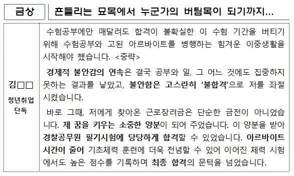 금상에는 취업 준비 기간 동안 근로장려금을 수급해 아르바이트 시간을 줄이고 공부에 전념할 수 있어 공무원 시험에 합격, 이후 경찰관이 되어 위급한 산모를 도운 미담으로 뉴스에 소개되었다는 김 모씨의 이야기와 ‘여섯 가족이 살아가는 데 가뭄의 단비, 힘들 때 구명튜브가 되어 준 국세청 근로·자녀장려금에 고맙고, 감사한 마음’을 진솔하게 써 내려간 네 자녀의 아빠 정모씨의 수기 등 총 3편이 선정됐다.