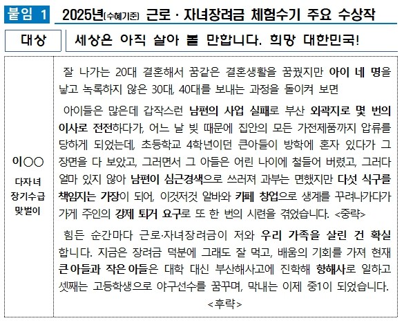 국세청(청장 임광현)은 2025년 근로·자녀장려금 수혜자(가족)를 대상으로 지난 10월 1일부터 11월 17일까지 ‘체험수기 공모전’을 실시, 우수작 20편을 최종 선정했다고 밝혔다.