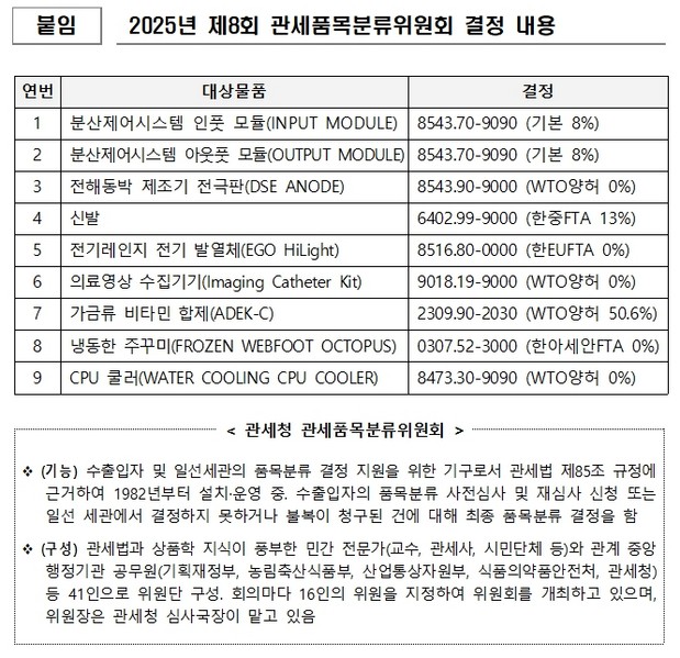 관세청은 지난해 12월 16일 개최된 ’2025년 제8회 관세품목분류위원회‘에서 총 9건의 품목분류를 결정하고, 해당 내용을 반영한 「수출입물품 등에 대한 품목분류 변경고시」 개정안을 1월 22일 관보에 게재했다고 밝혔다.