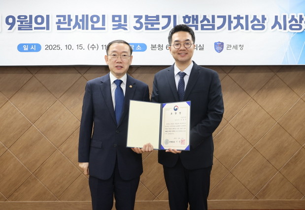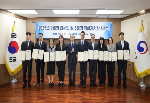 관세청은 10월 15일 2025년 9월의 관세인 및 업무 분야별 유공자와 2025년 3분기 핵심가치상 수상자를 선정해 시상했다고 밝혔다.