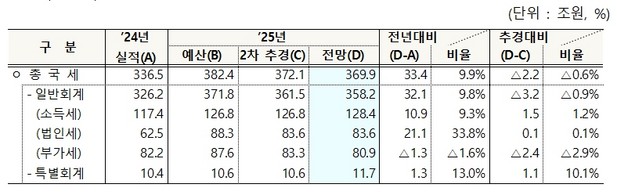 기획재정부는 세입예산 혁신 TF에서 1차관 주재로 금년 세수 상황을 점검한 결과 올해 국세수입은 전년(336조 5천억원) 대비 33조 4천억원 증가한 369조 9천억원으로, 6월 추가경정예산(372.1조원) 대비 2조 2천억원 부족할 것으로 예상된다고 25일 밝혔다.