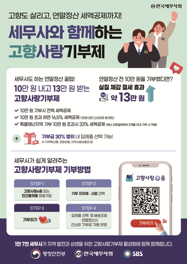 한국세무사회(회장 구재이)는 19일 고향사랑기부제가 근로자뿐 아니라 사업자에게도 실질적인 절세 수단이 될 수 있다며 세액공제와 필요경비 처리 구조를 정확히 이해하고 적극 활용할 것을 당부했다.