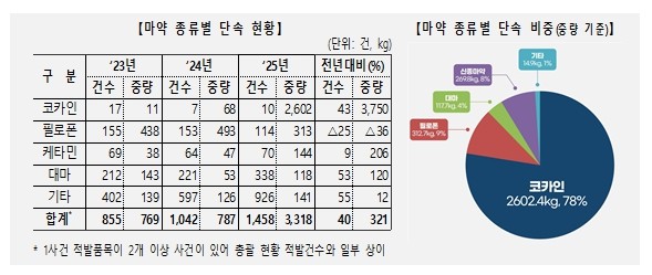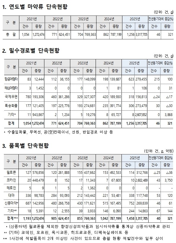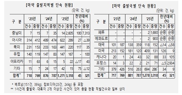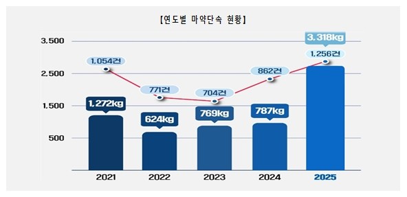 관세청은 2025년 한 해 동안 국경단계에서 총 1,256건, 3,318kg의 마약류를 적발했다고 21일 밝혔다. 이는 지난 해와 비교하면 적발건수는 46%, 중량은 321% 증가한 것으로, 건수와 중량 모두 역대 최고치를 기록했다고 관세청은 덧붙였다.