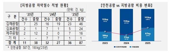 ’25년은 인천공항을 제외한 지방공항에서도 총 36건, 87kg의 마약이 적발되는 등 지방공항 우회 밀반입이 증가하는 추세를 보였다.