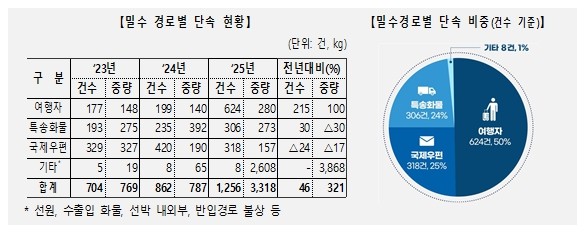 관세청에 따르면, 밀수경로별로 보면 여행자는 건수와 중량이 모두 대폭 증가했고, 특송화물은 적발 건수는 증가했지만 중량은 감소했다. 또, 국제우편의 적발 건수와 중량은 모두 감소했다.