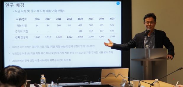 | ▲12일 ‘KARI Accounting and Sustainability Research Seminar’에서 백복현 서울대 교수가 연구논문을 발표하고 있다.[한국회계기준원 제공] |