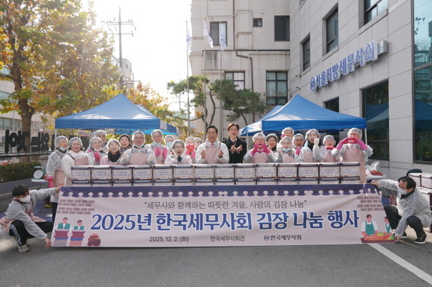 한국세무사회(회장 구재이)는 연말을 맞아 12월 2일 한국세무사회관 앞마당에서 ‘2025 사랑의 김장 나눔’을 열고, 직접 담근 김장김치 300포기를 서초구푸드뱅크마켓센터에 전달했다.
