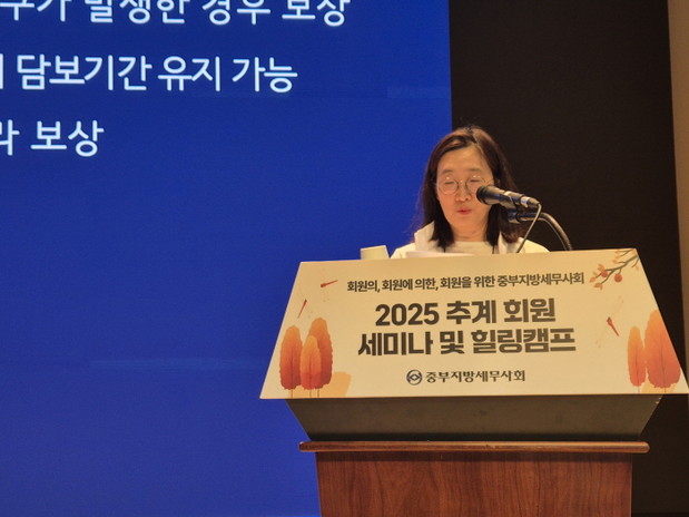 | ▲고미진 중부세무사회 조세제도연구위원장이 25일 중부세무사회 세미나에서 ‘세무사배상책임보험 적용 사례’에 대해 연구자료를 발표하고 있다. |
