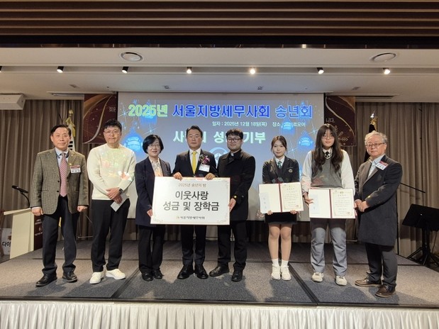 | ▲이종탁 서울세무사회장이 이웃사랑 성금 및 장학금을 전달한 후 기념촬영을 하고 있다. |
