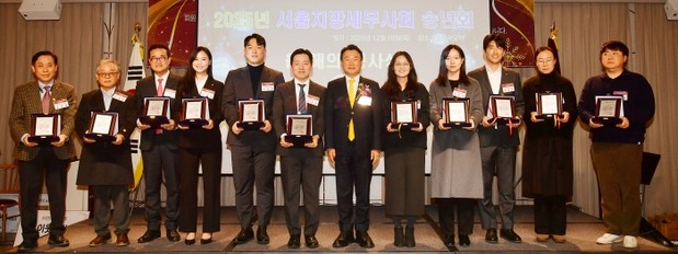 | ▲18일 서울세무사회 송년회에서 올해의 봉사상 수상자들이 이종탁 서울세무사회장과 기념촬영을 하고 있다. |