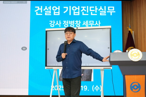 | ▲19일 건설업 기업진단실무 교육에서 강의를 하고 있는 정병사 세무사. |